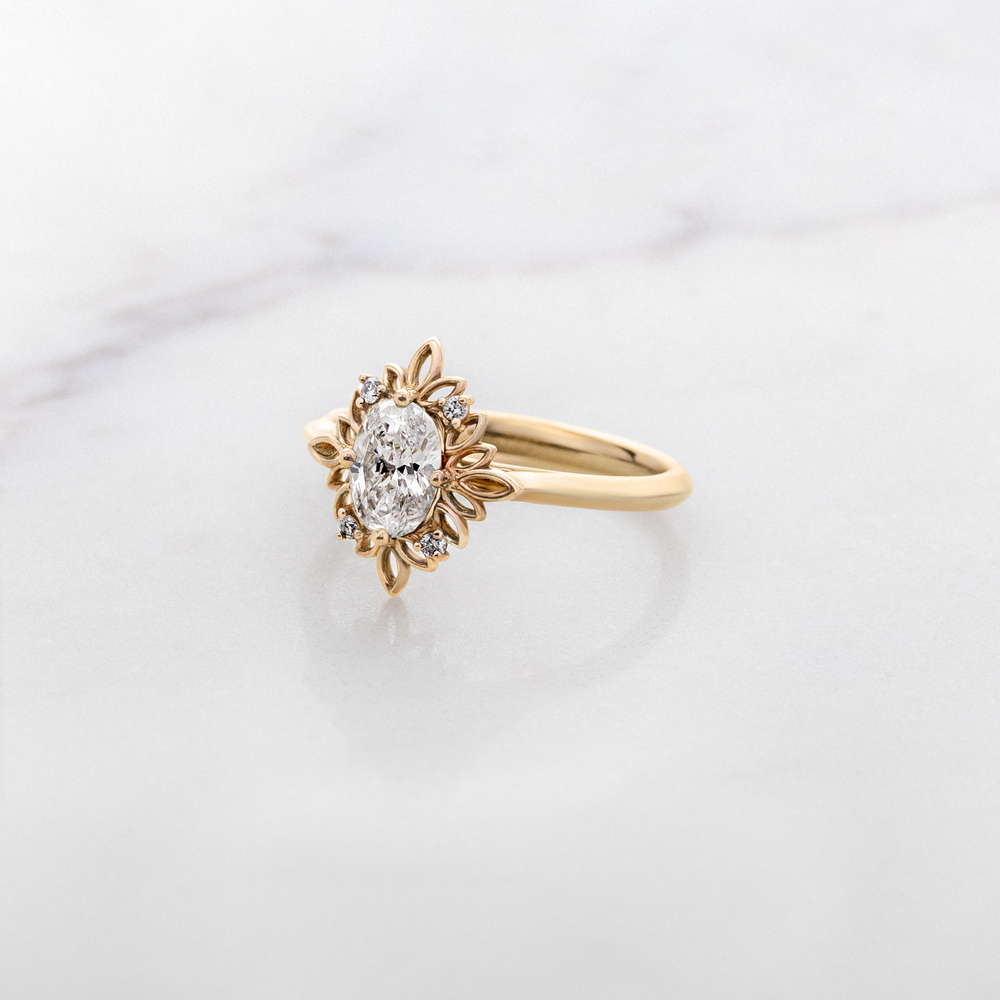 Ivy features a leafy halo with four petite diamonds, like sparkling buds nestled in lush foliage. The leaves are part of a lofted head that allows this style to stack with any straight wedding bands.