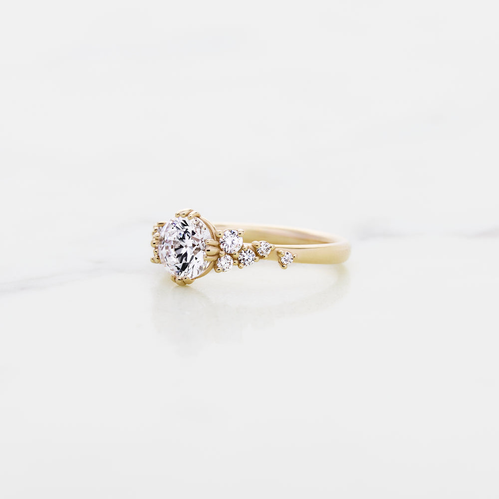 An irregular cluster of diamonds taper from the center stone into the band, creating a perfect dusting of sparkle. This ring is built to stack with straight bands, making it extremely versatile when it comes to wedding band selection.