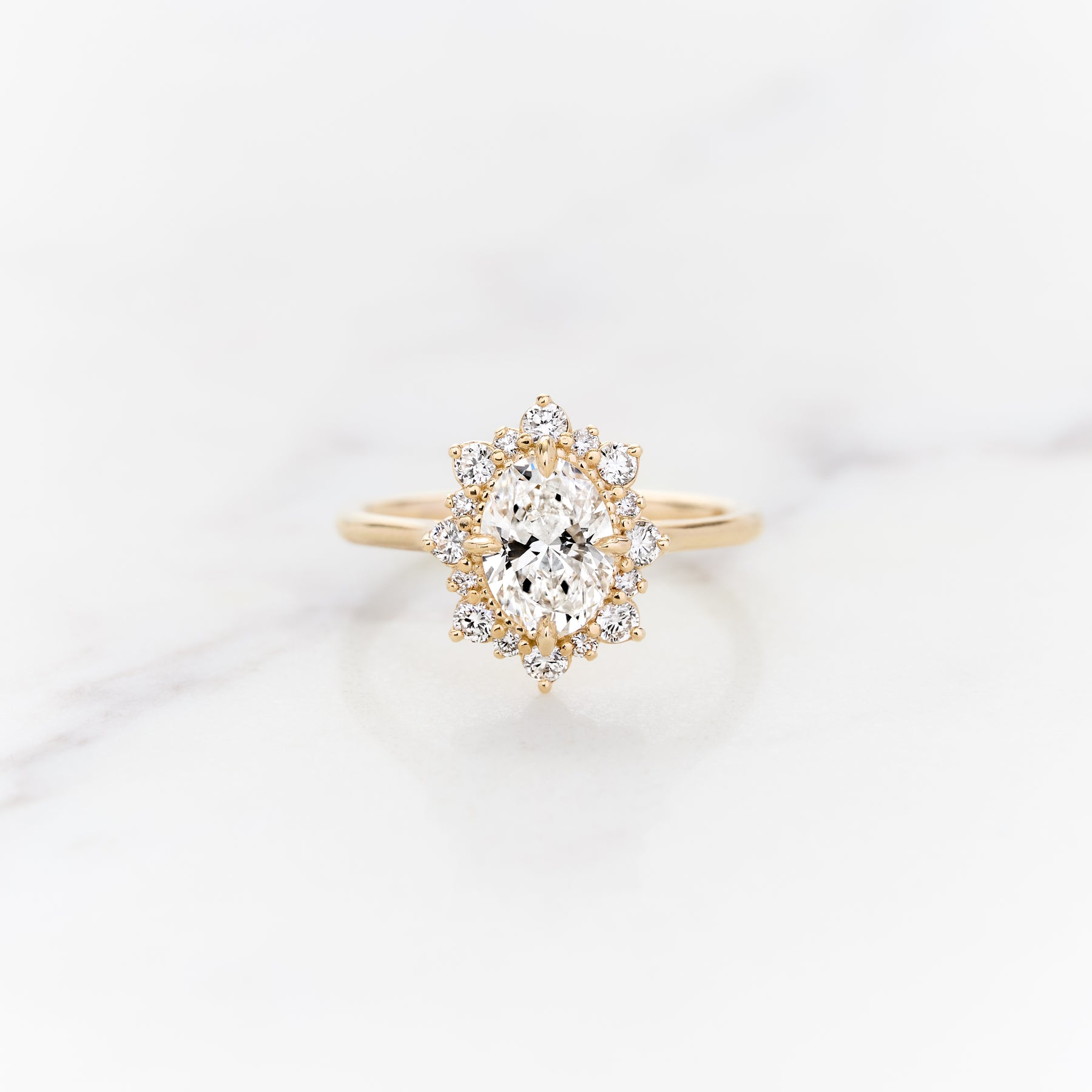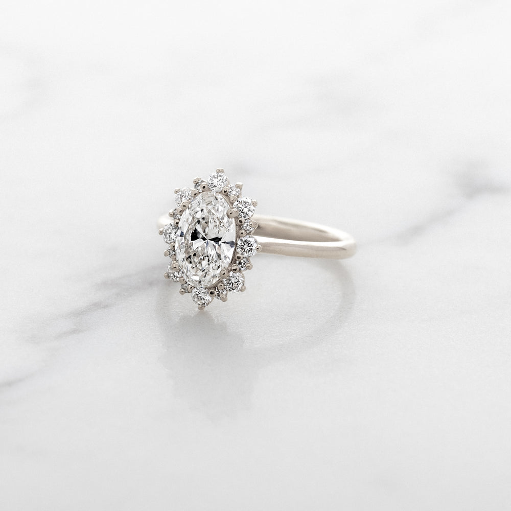 Inspired by some of our favorite rings from the Edwardian era, our Violet halo has some modern-day upgrades! Alternating stone sizes in the halo add character and interest, and the stones are tilted slight outward like the petals of a summer flower. A lofted head means this ring can stack with any straight wedding bands without gapping or unnecessary rubbing, while still being set low on the finger for easy wearability.
