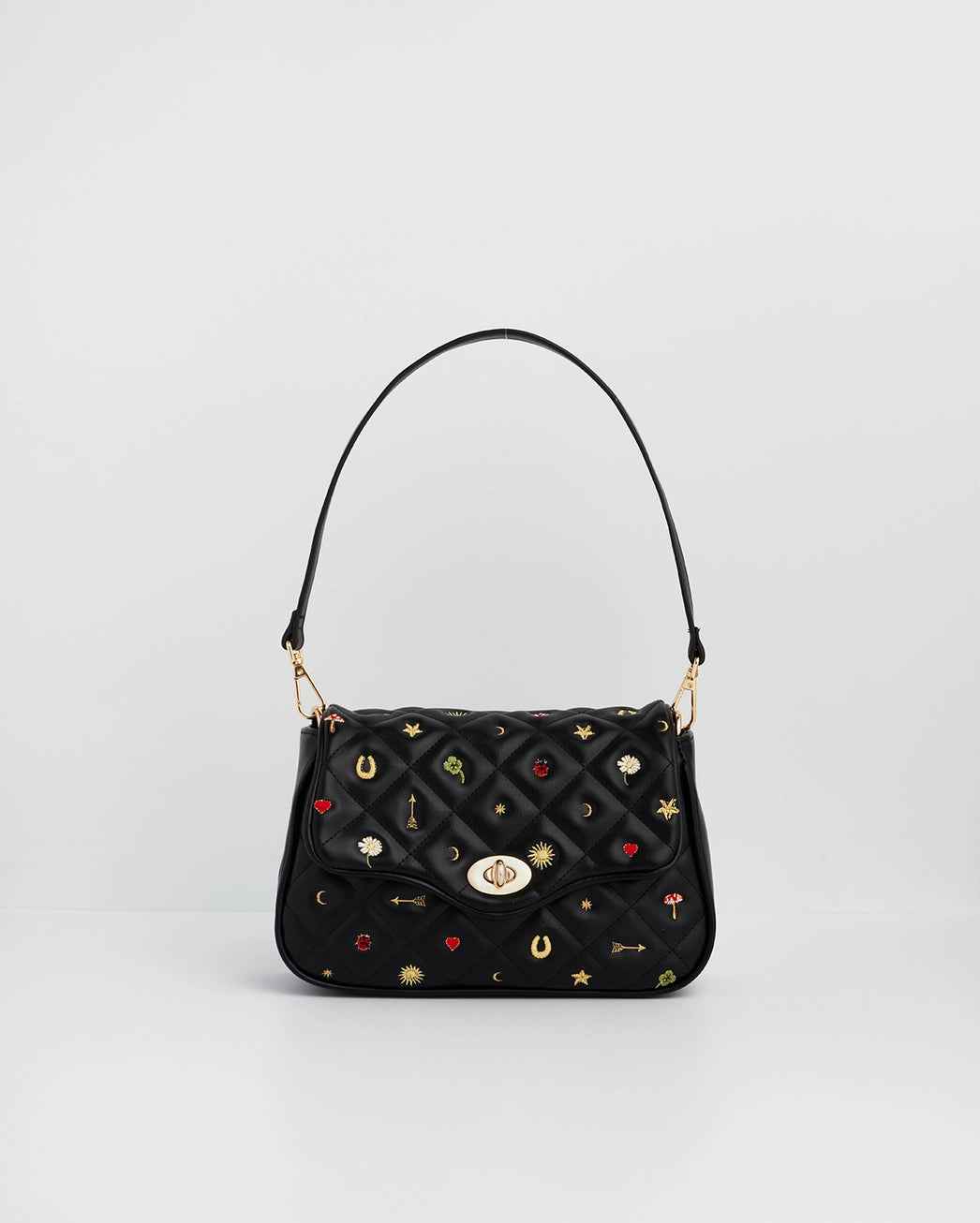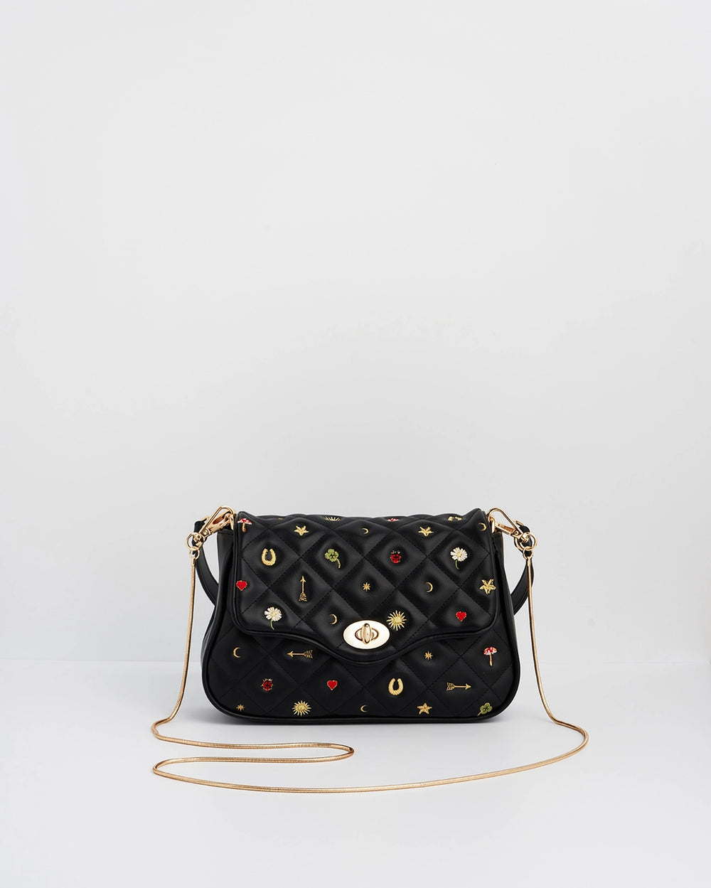 Fable Black Quilted Motif Embroidered Crossbody Bag