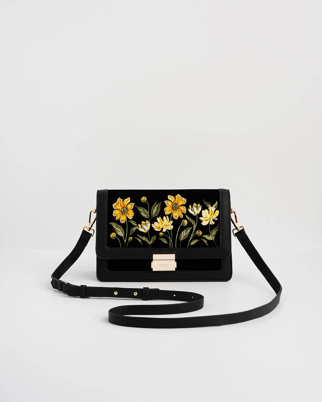 Elegant and versatile, the Black Botanical Embroidered Foldover Bag blends timeless style with intricate detailing. Crafted from soft black velvet and beautifully embroidered with a delicate botanical motif, this sophisticated design is finished with a polished gold tone push lock clasp engraved with the Fable logo, a signature touch of refinement. The foldover silhouette opens to reveal two internal compartments and a central zipped pocket to keep your essentials neatly organised. With a detachable 43" shoulder strap for hands-free wear, it’s perfect for both day and evening occasions.
