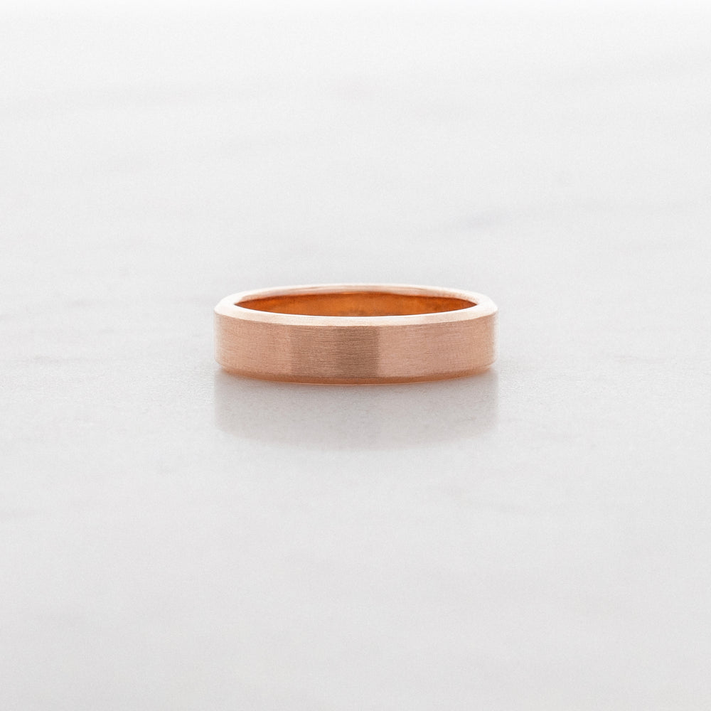 Clean, modern, classic. Flat on the outside and curved on the inside (for comfort), with chamfered edges for a dash of contemporary geometric detail. With a matte finish, the edges are left high polish for a bit of extra contrast.