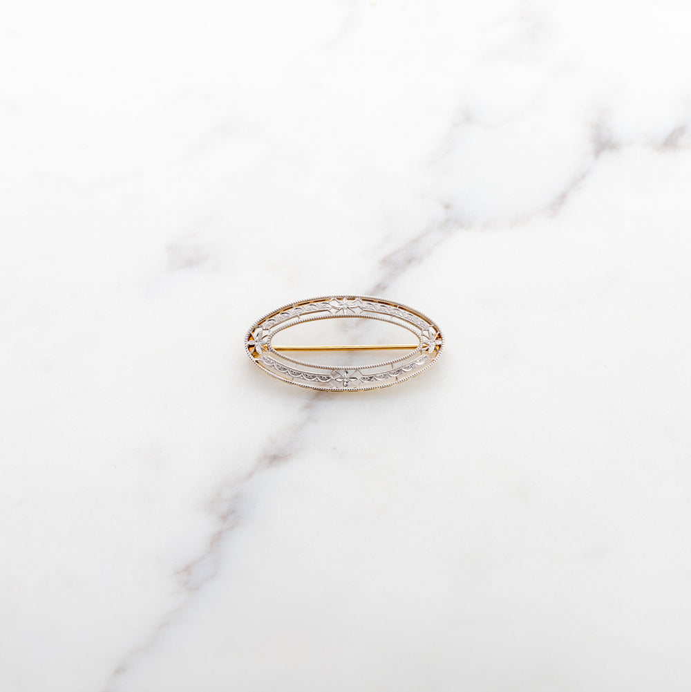 A two tone pin with scalloped engraving and petite floral details at compass points.