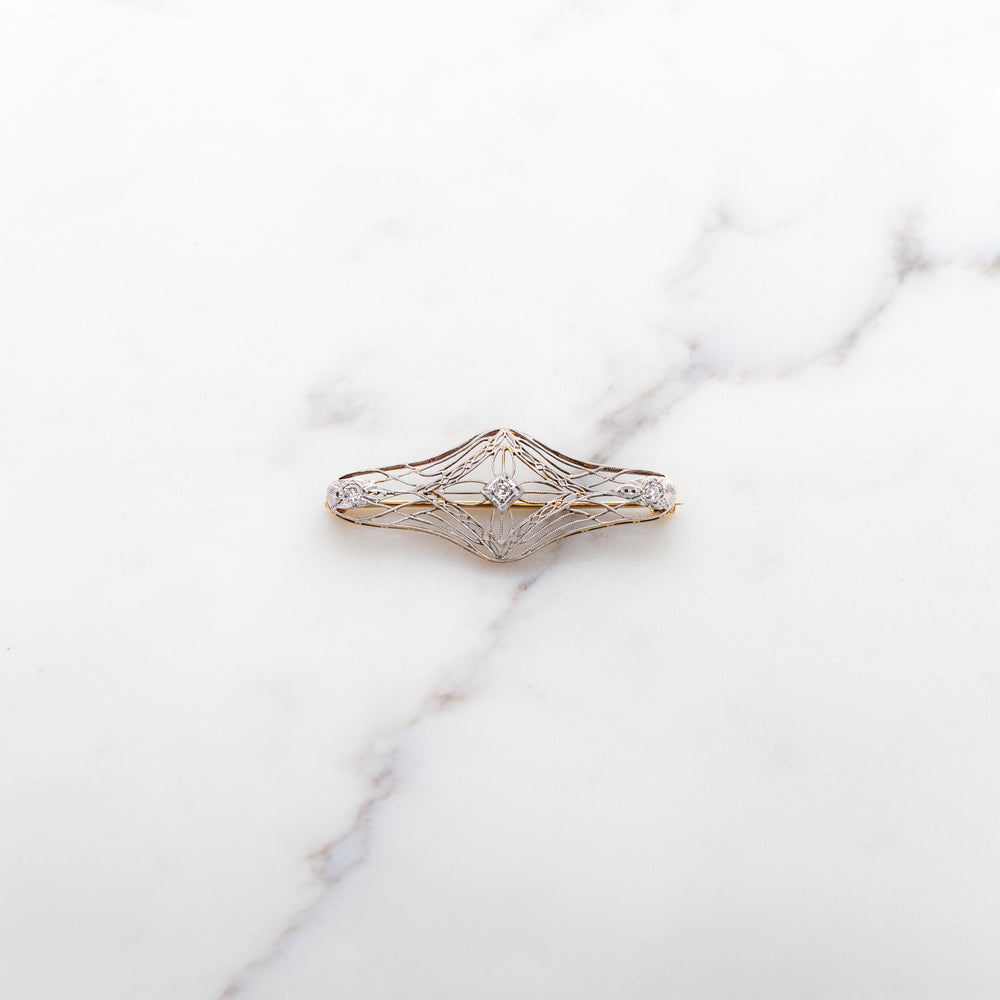 A two tone pin with swooping art nouveau lines, featuring 3 brilliant cut natural diamonds.