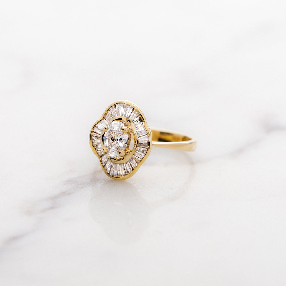 This super special vintage mount needed a little love and a new focal stone. We adore the way the baguettes undulate like the flattering of a ballerina's tutu (hence the name for this classic ring style). An oval lab grown diamond was selected for the middle and it is so gorgeous. Although this antique beauty was a one of a kind, we'd love to make a new one!