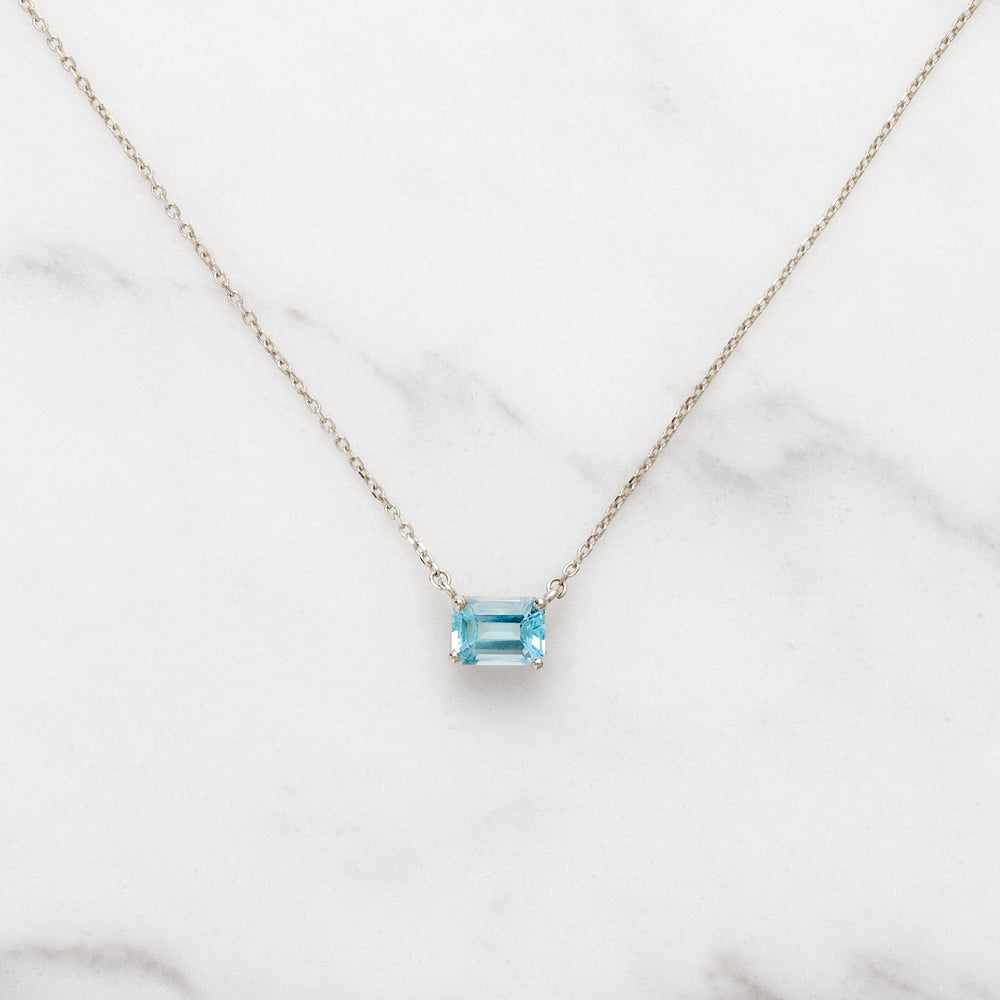 This emerald cut Sky Blue Topaz hangs horizontally for a modern take on a classic piece.